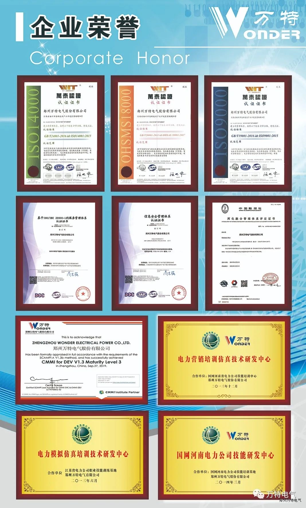 鄭州萬特電氣股份有限公司踐行精益求精的理念,擁有萬分之一標準電能表技術、大功率高穩(wěn)定度測試電源技術、智能表計故障仿真技術、電能表接線數據模型、云電源潮流算法、智能變電站加載模型算法、安全實訓模型、全場景虛擬現實擬態(tài)、人工智能AI判別等若干項核心技術。